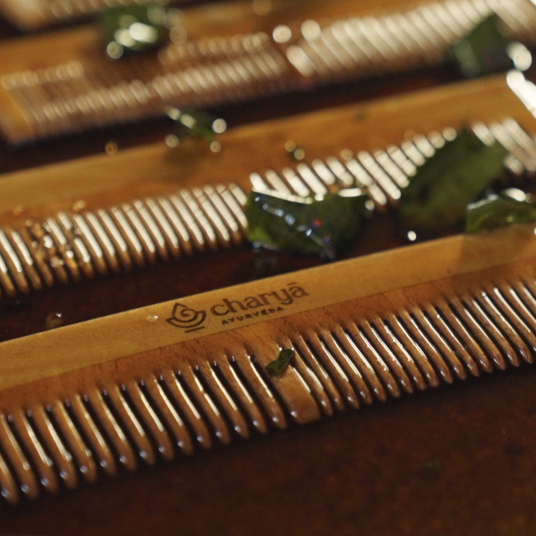An Ayurvedic antibacterial Dual-Tooth Neem Wood Comb infused with Neem, Karanja & Camphor oils to reduce dandruff, improve scalp health, minimise hair fall and gently stimulate scalp circulation.