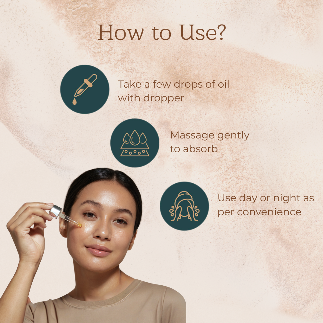 How to use: 1. Drop a few drops of oil on your face with the given dropper 2. Gently massage until the oil is completely absorbed 3. Leave it overnight 4. For better results use Charya Ubtan for face wash