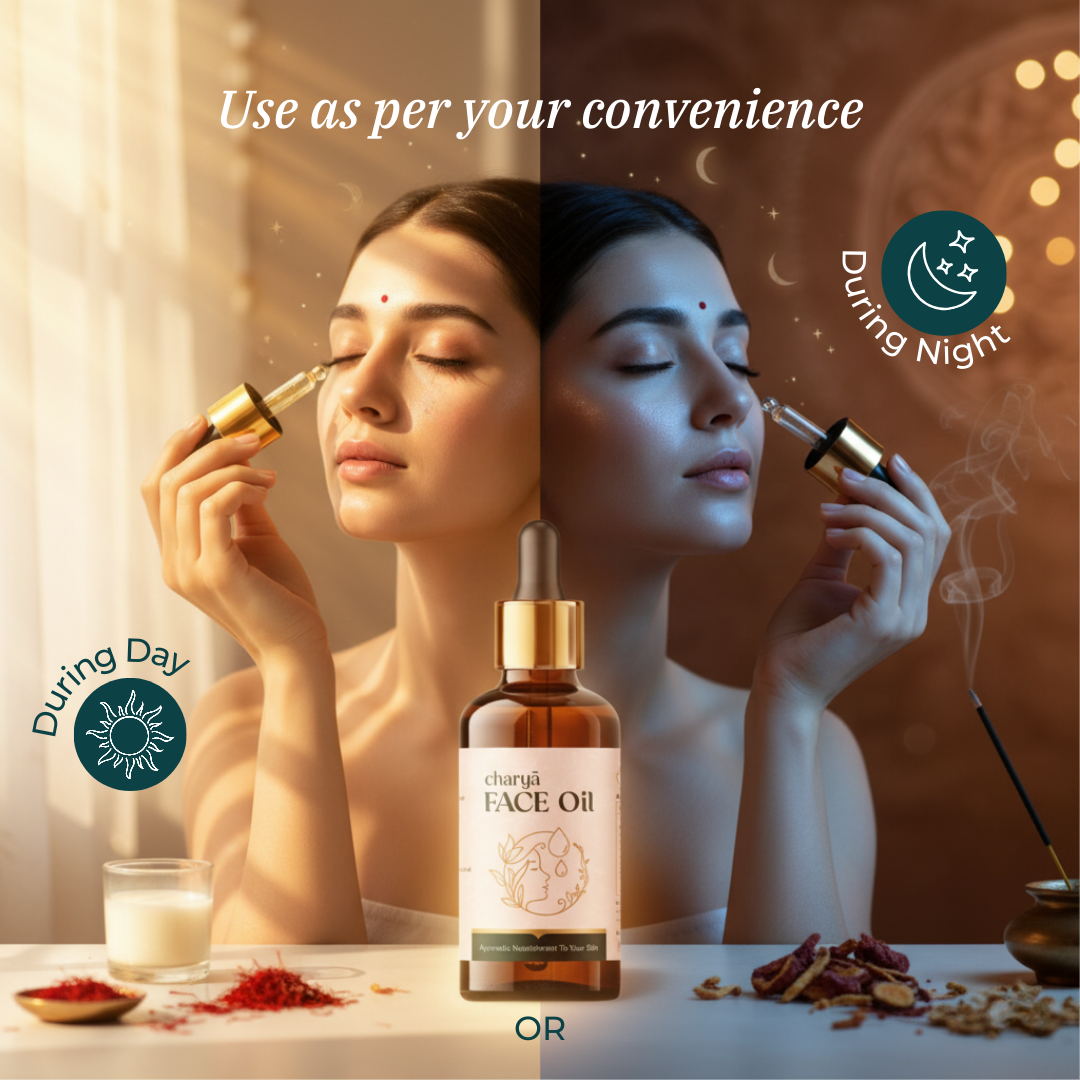 We recommend Charya Face Oil be used before going to bed so that it can be left overnight on the skin enabling it to get absorbed by the skin properly.