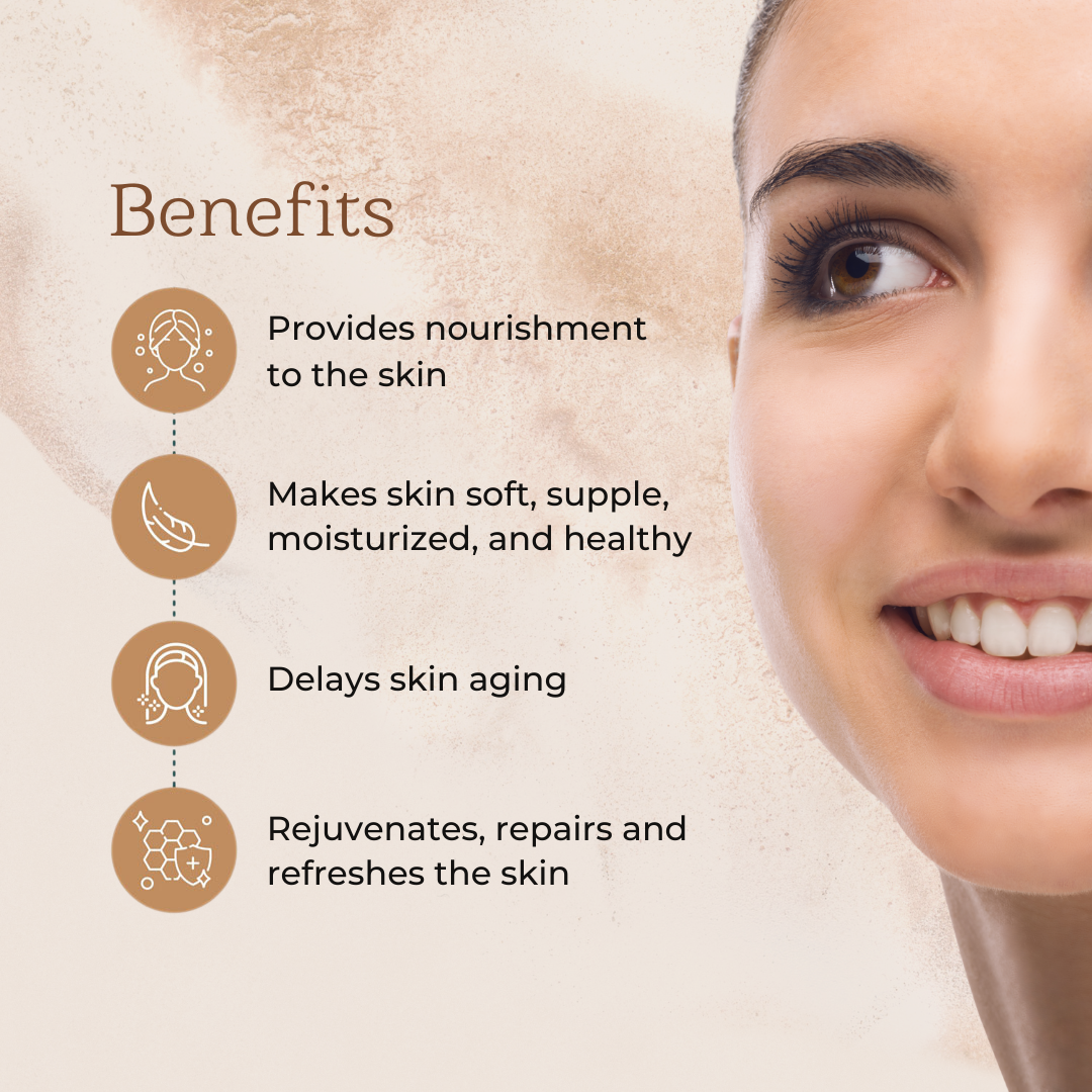Benefits: 1. Nourishes the skin from within 2. Reduces dark spots, pigmentation, and blemishes 3. Leaves skin soft, supple, moisturized, and healthy 4. Delays skin aging 5. Rejuvenates, repairs, and refreshes the skin