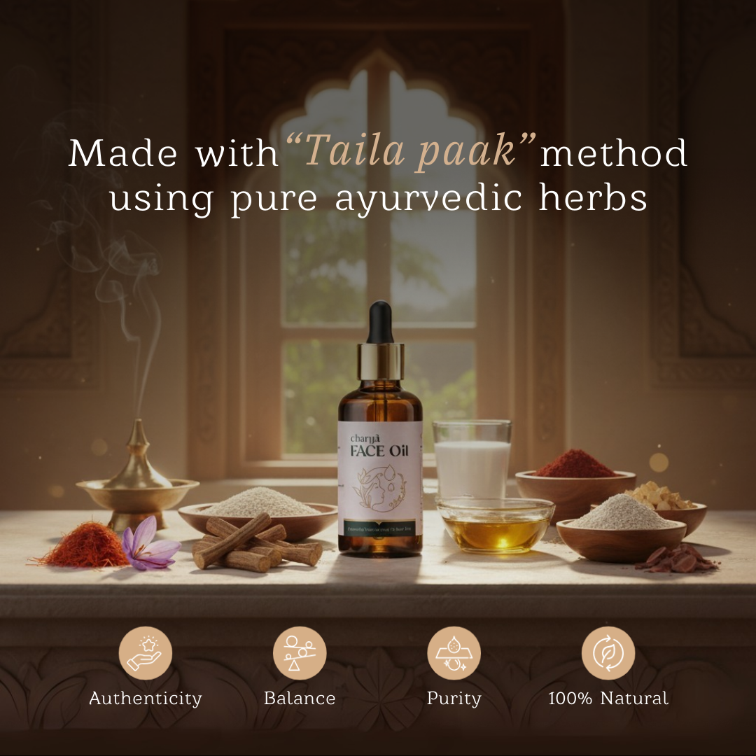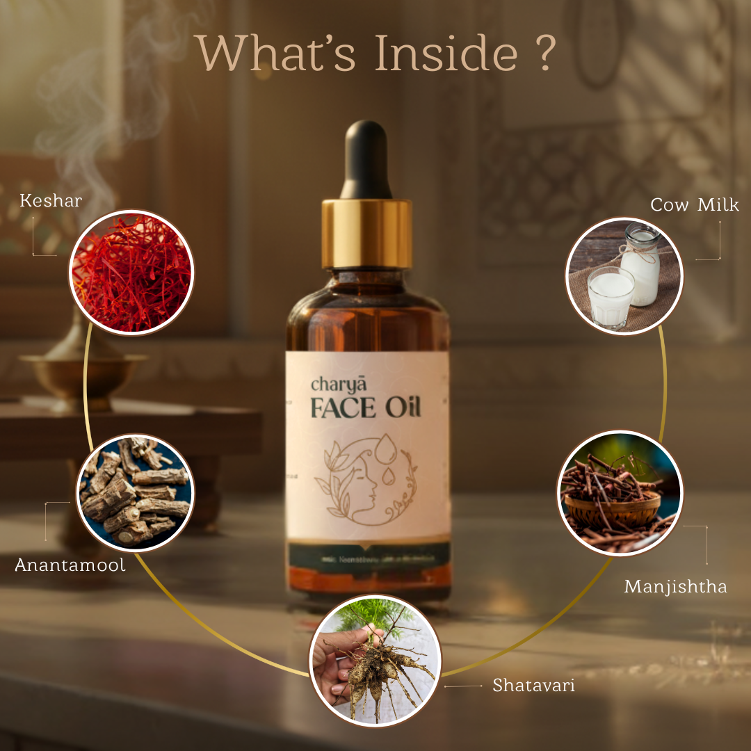 Charya Ayurvedic Face oil is crafted using a blend of carefully selected natural ingredients Shatavari,Manjishtha, Yashtimadhu, Kesar, and milk.